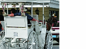 A horse drawn carriage on a city street. Good for carriage builders, or owners.