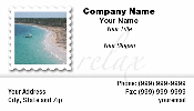 Tropical stamp business card with relax word faintly in background. Picture of boat on the beach in the ocean. Caribbean waters. Great for travel agent, tour guide, cruise ship center, fun, entertainment, tourism board.
