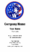 business card illustration of an american minuteman looking up with US stars and stripes flag in background enclosed in a circle