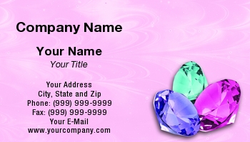 This business card design features three gems in pink, purple and turquoise on pink and white swirled background. Perfect for jewelers or retail jewelry stores.