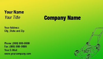 Landscaping business card. Yellow and green colors represent sun and green grass with image of a lawnmower