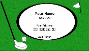 Textured grass green background with golf club, ball, and flag illustration and white oval for company information. Suitable for golfer, country club, golf shop, or any sport equipment store.