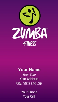 Zumba business card with purple to magenta background.